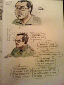 On the tail of that positivity, check out this article from the Miami NewTimes on my work. I’ll post a longer update on my talk (it was recorded, so perhaps even the video of it too) tomorrow, as well as some more sketches, and the lowdown on Joe Sacco’s talk.